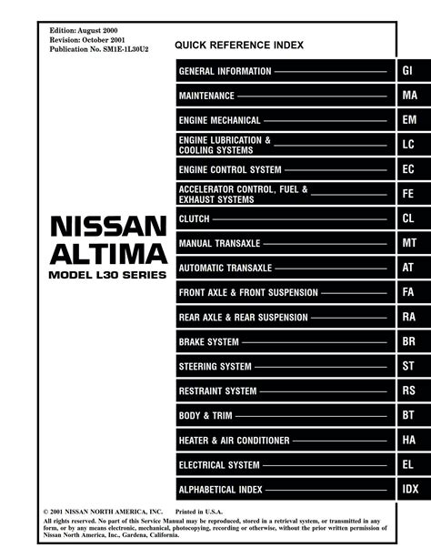 Everybody knows that reading Nissan Altima 2001 Factory Service Manual is helpful, because we can get a lot of information from your reading materials. Technology has developed, and reading Nissan Altima 2001 Factory Service Manual books could be easier and easier. We can read books on the mobile, tablets and Kindle, etc. Hence, there are numerous books being received by PDF format.